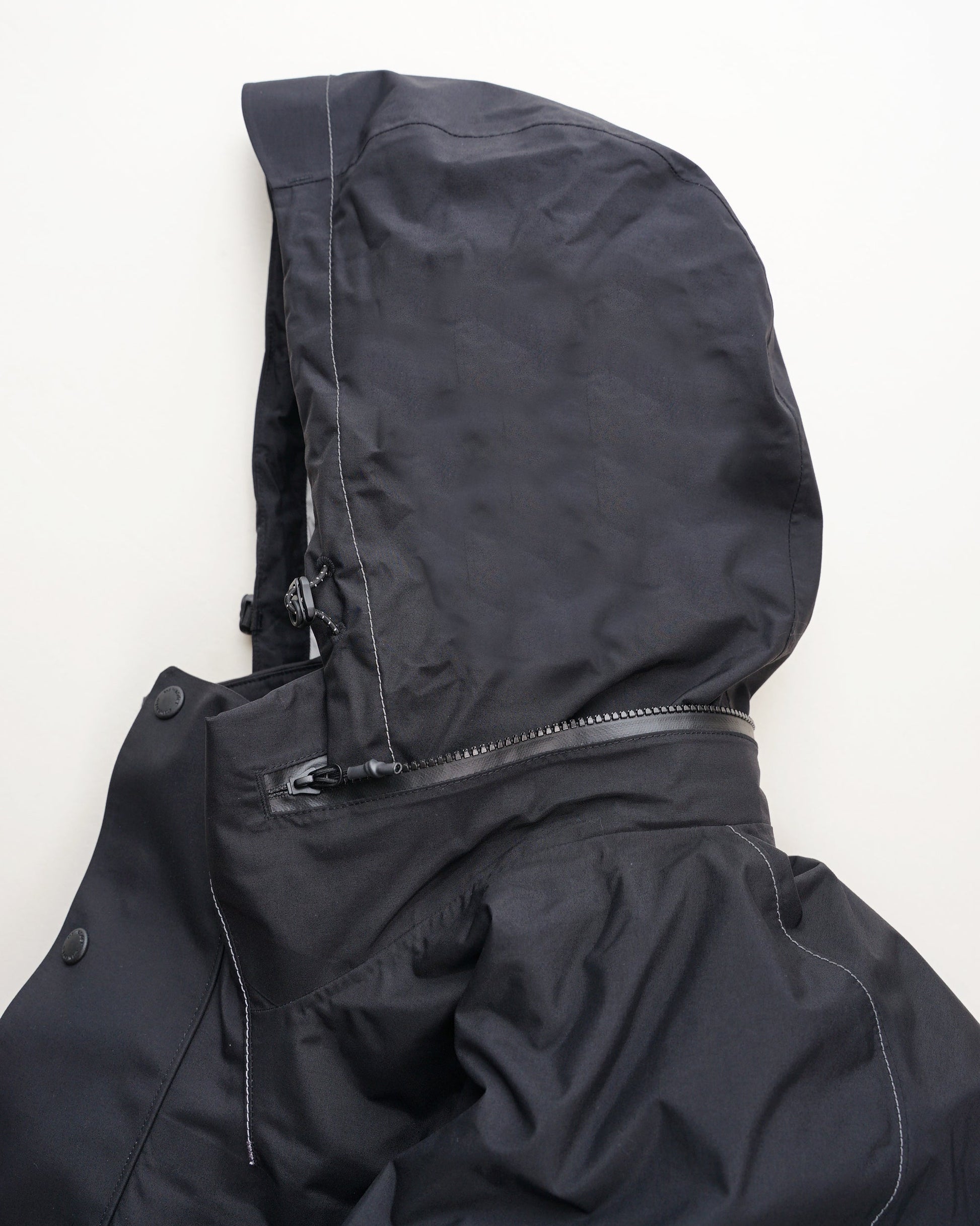 脇下のベンチレーションで体温調整がしやすく、未使用時のフードは襟に収めることができます。部分的にリフレクターステッチを施しており、夜間の視認性をあげています。