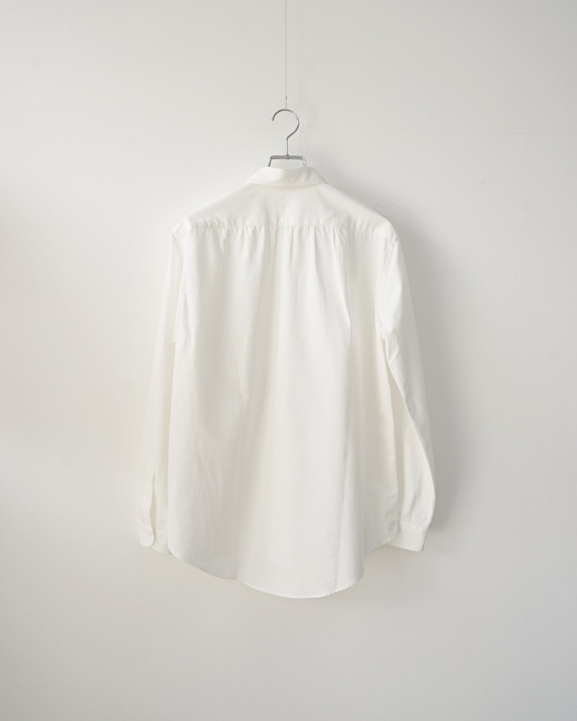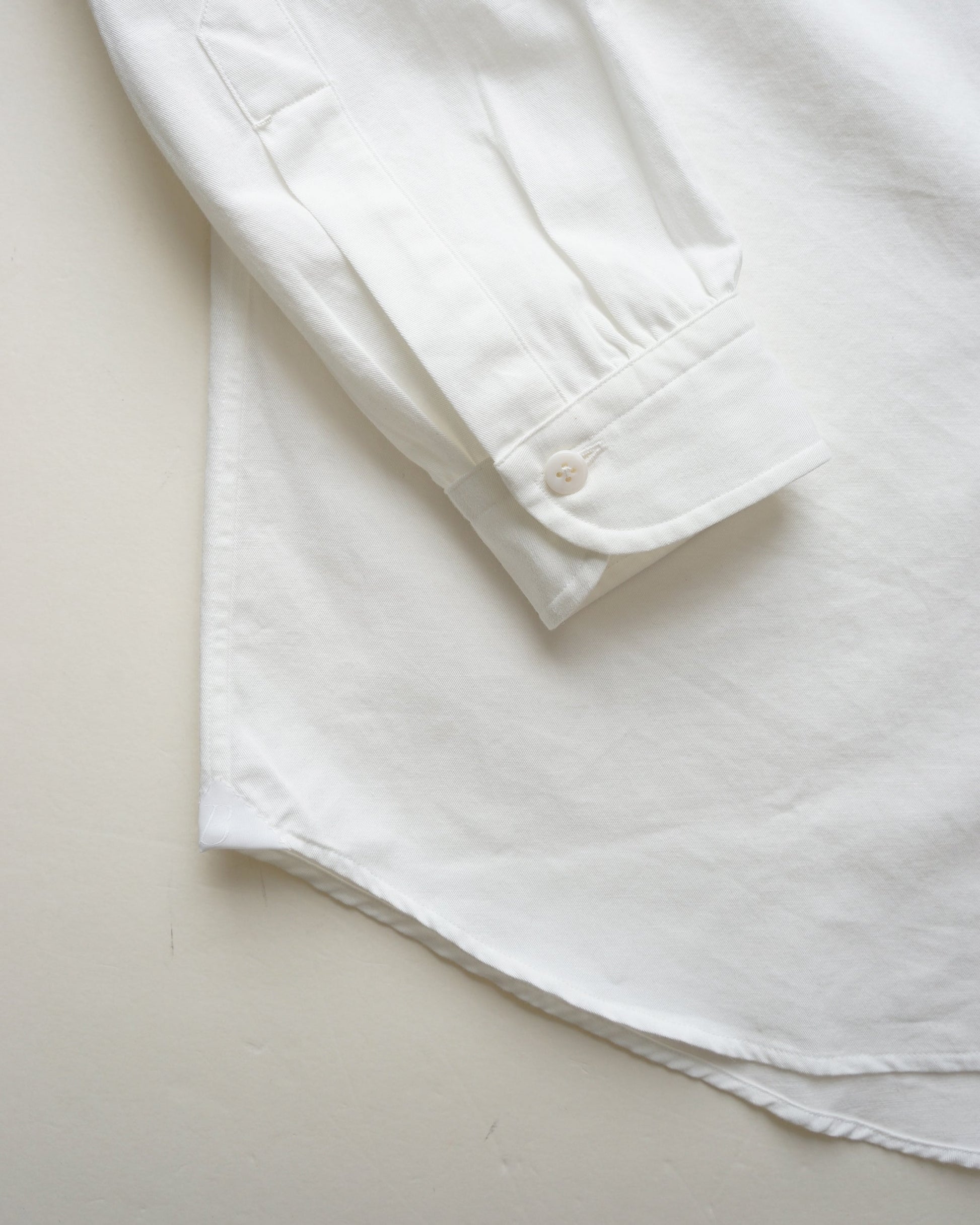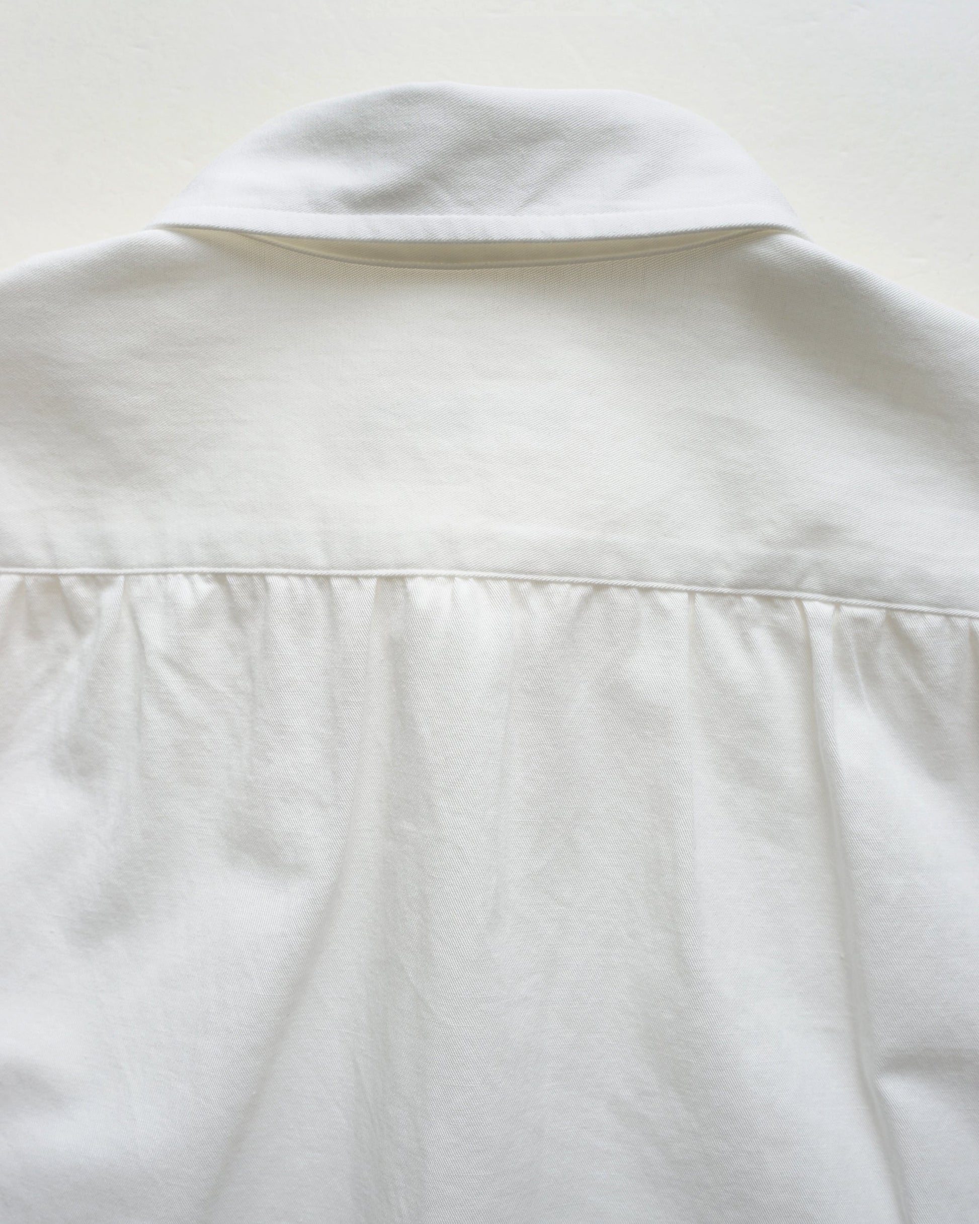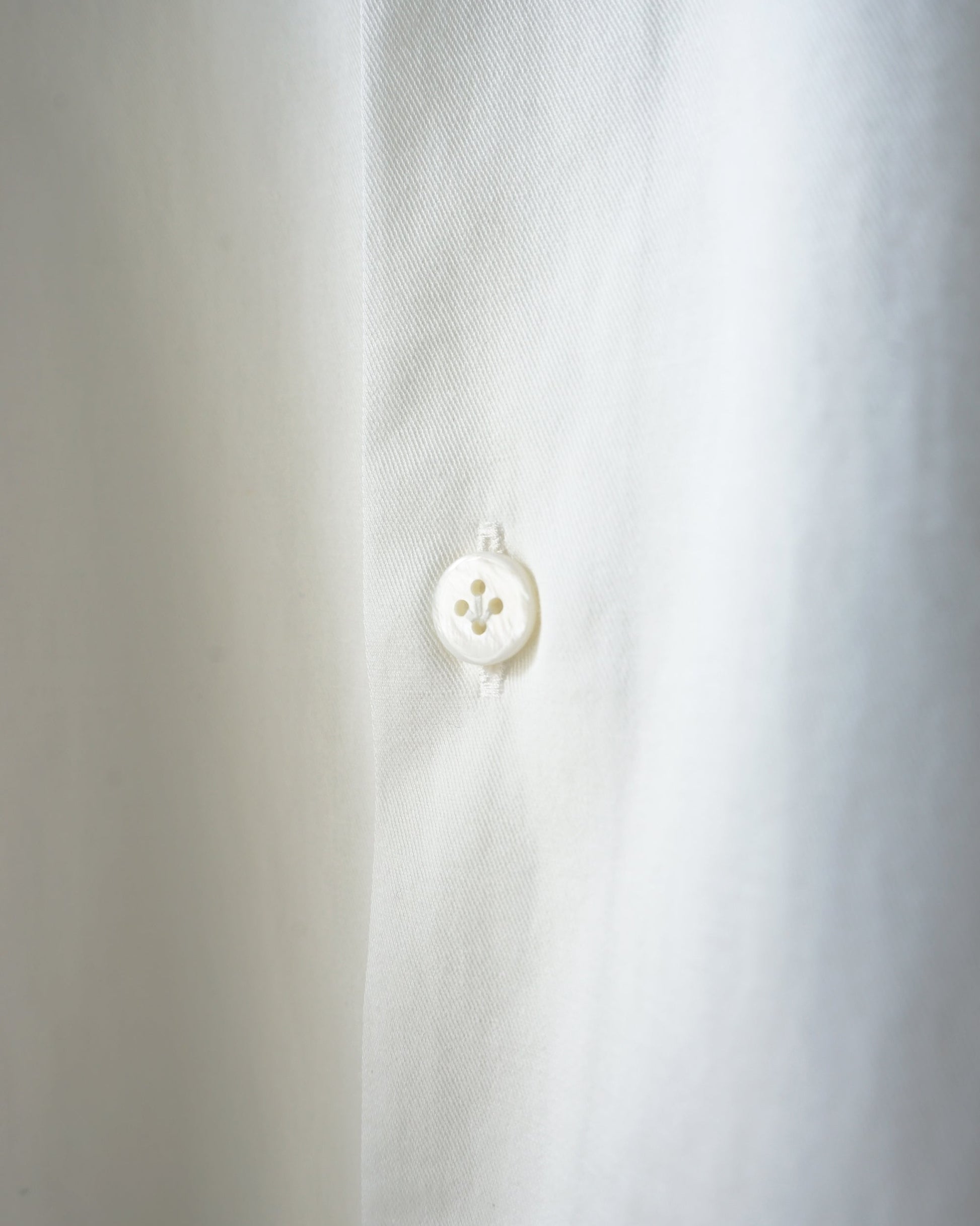 衿を開けた時にも軽さを感じるワイドカラー、スプリットヨークに後身頃はギャザーをよせ、両脇には手縫いのガゼットが配されています。また今回特別に生産終了しているAquellosのアイコニックな琵琶湖真珠ボタンを採用。