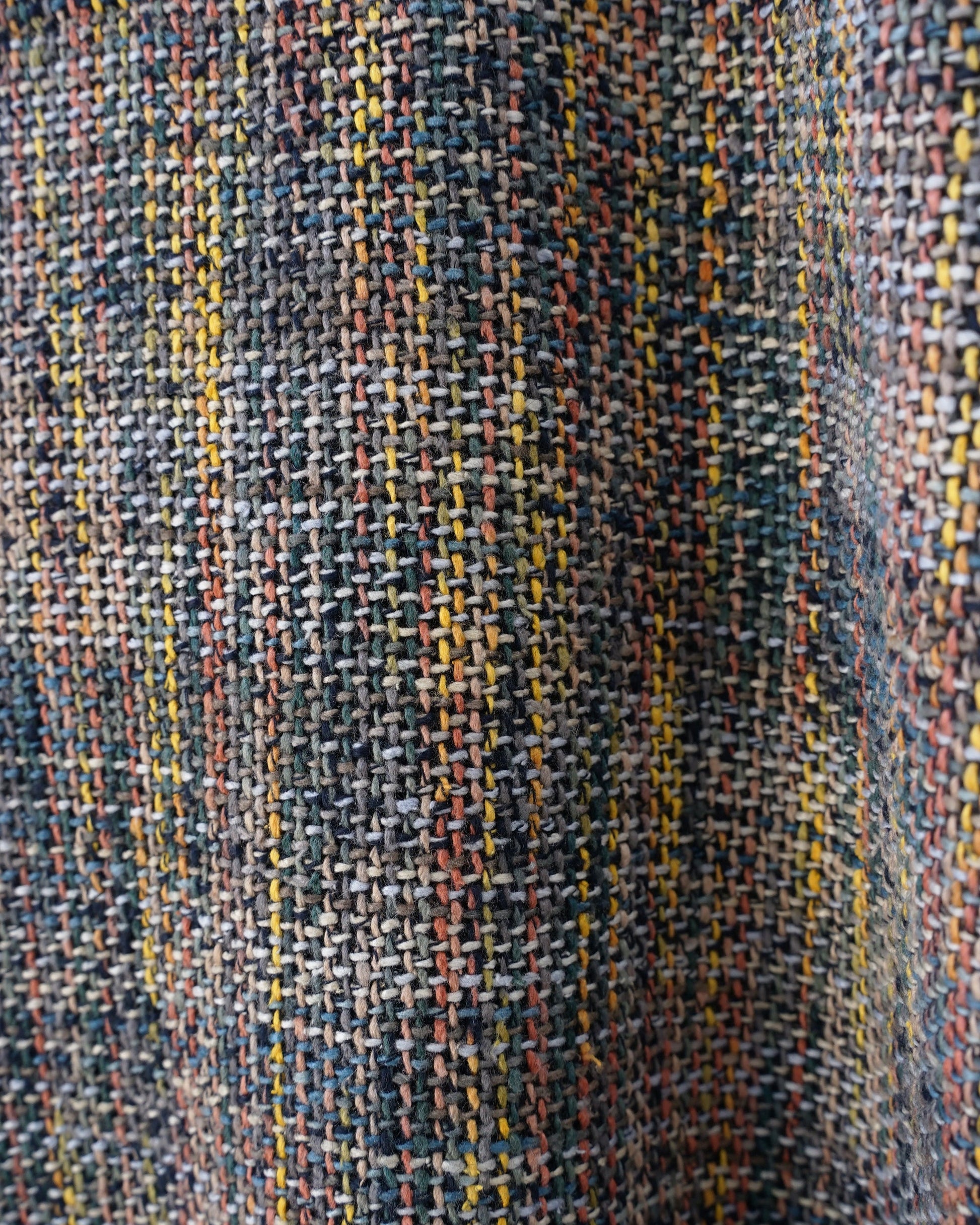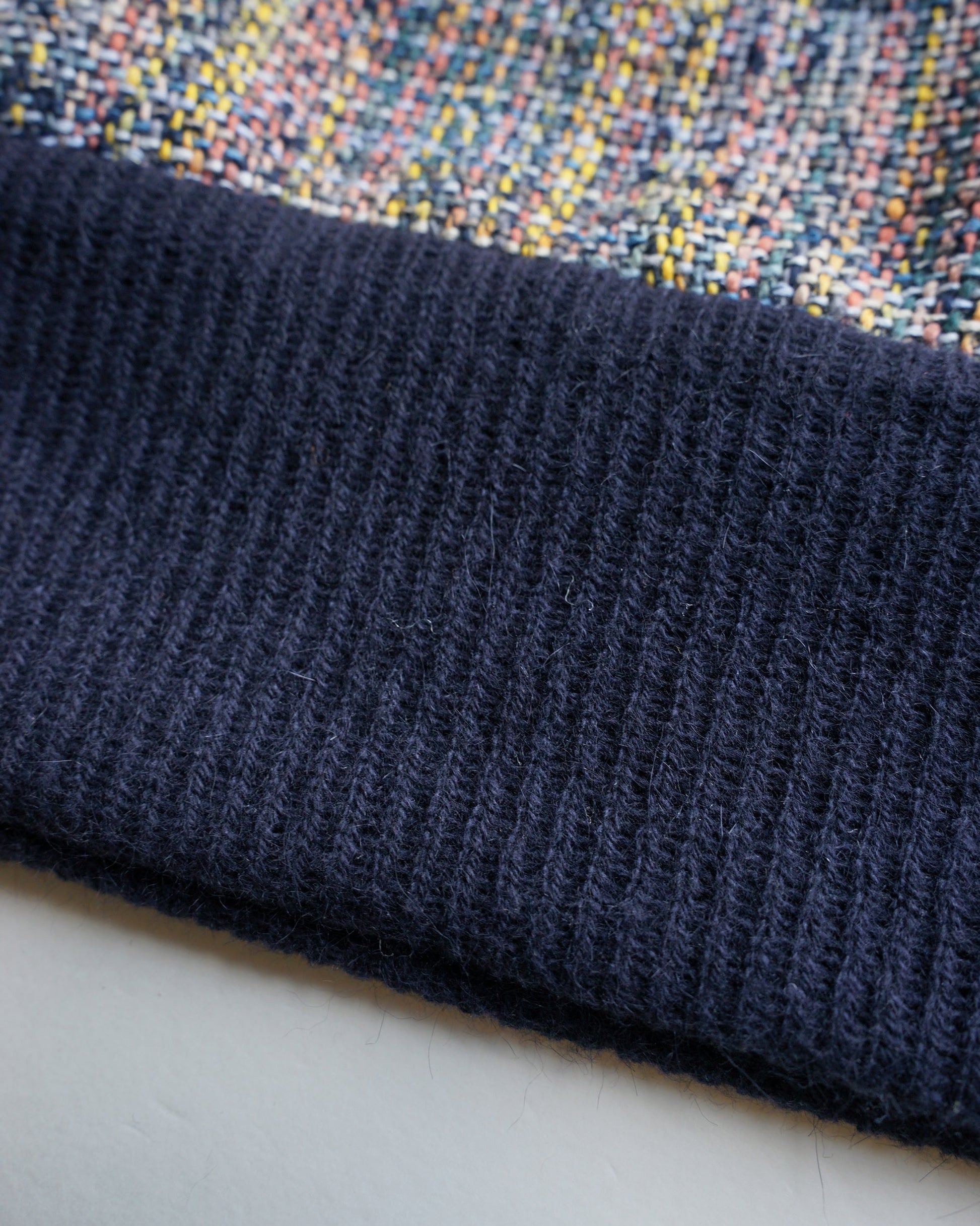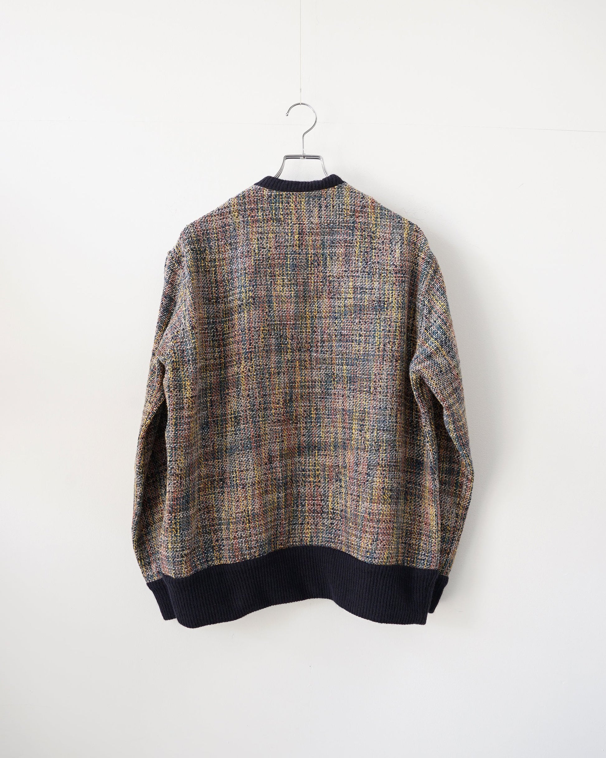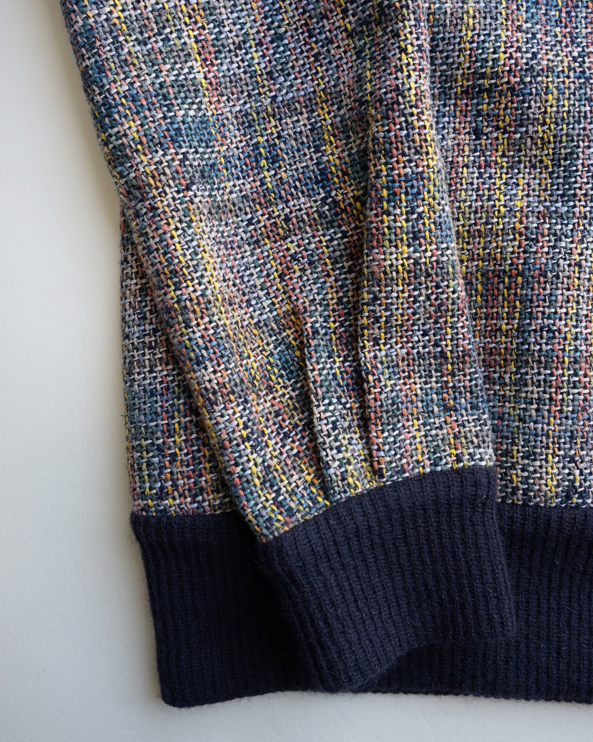 尾州では珍しいシルクに特化したメーカーで生み出されたシルクとコットンを撚り合わせた特別なスラブ ヤーンはイエロー、ピンク、ブルー、グリーンなど見える限りは9~10色ほどを使用して正にマティスのタッチのような大胆さを表現。細いウール糸で生地の安定を求め、またそれが全体を引き締めてくれます。鮮やかな面を”Early morning”、ダークな面を”Midnight"と名付けた両面使用の生地です。