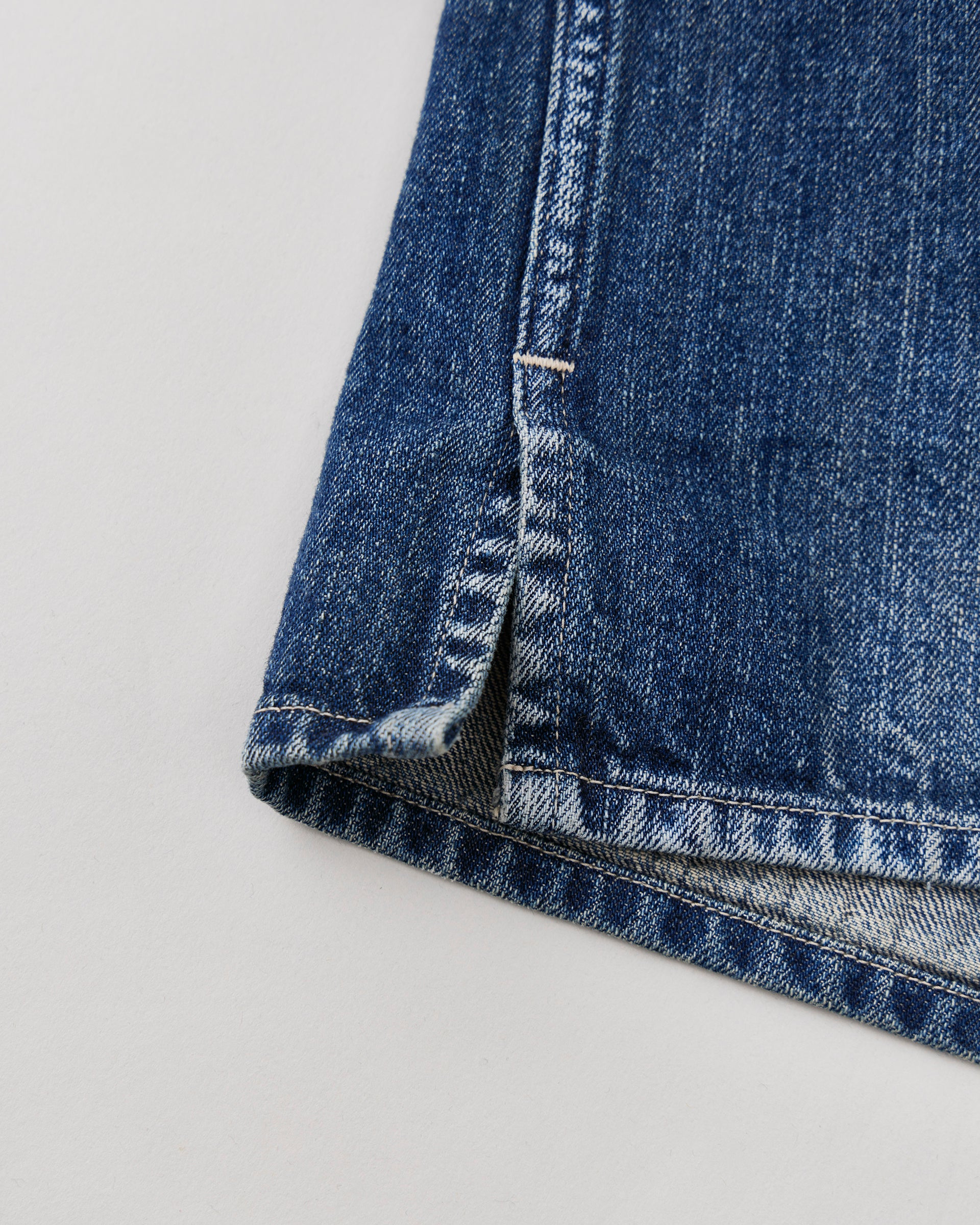 シャトル織機で丁寧に織り上げた生地は、重すぎず軽すぎない適度な厚みと柔らかさが特徴。着用を重ねたような縦落ちの風合いを表現するため、職人の手作業による加工が施されています。