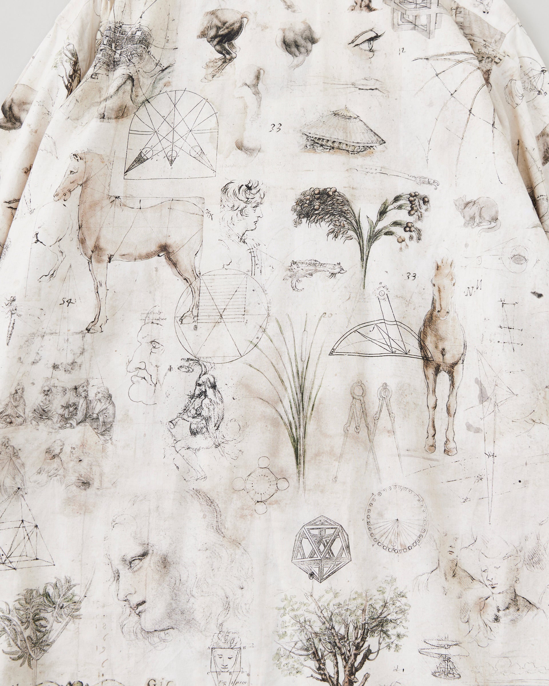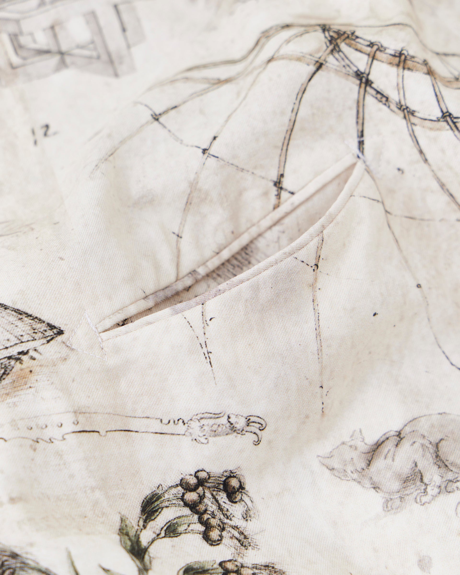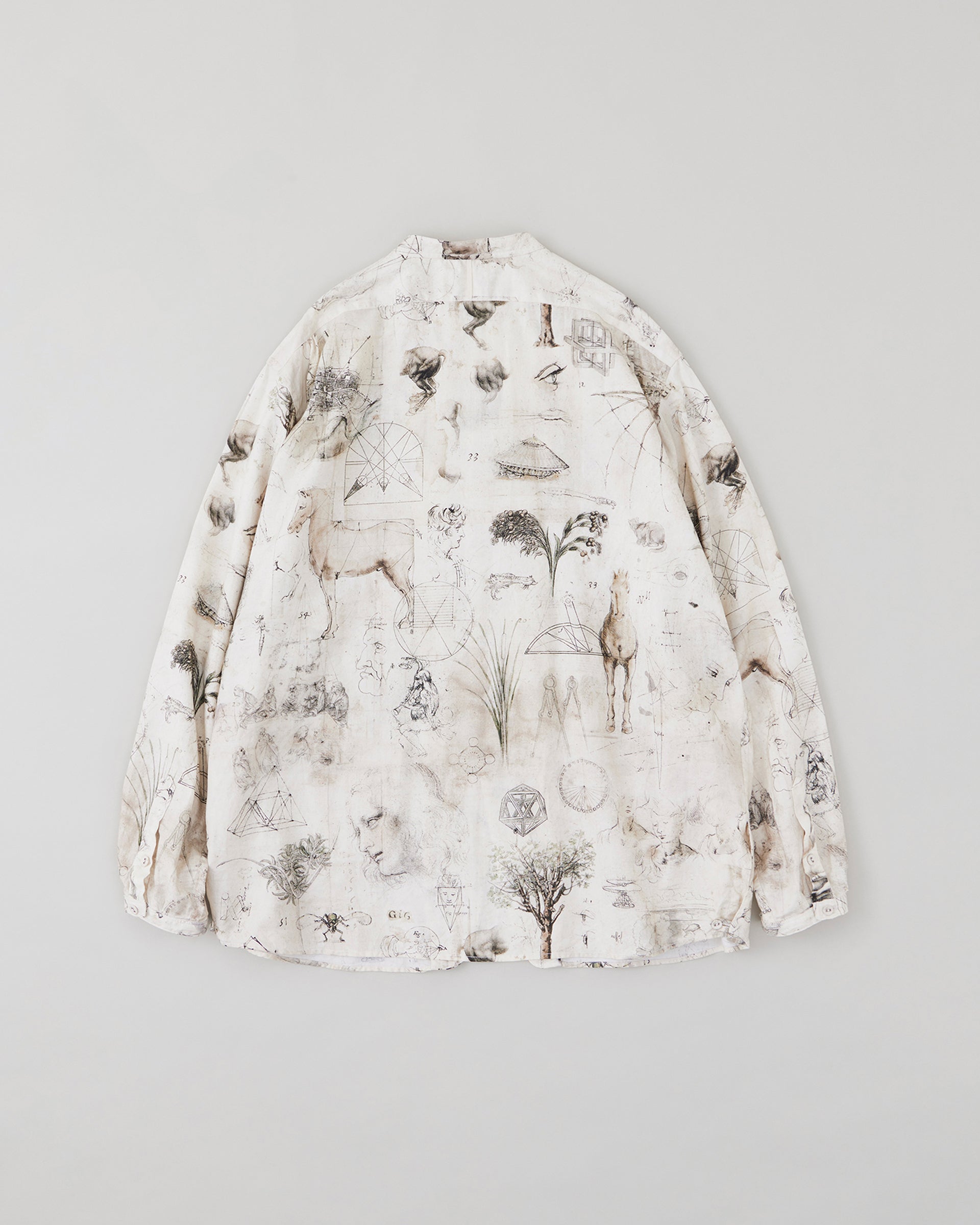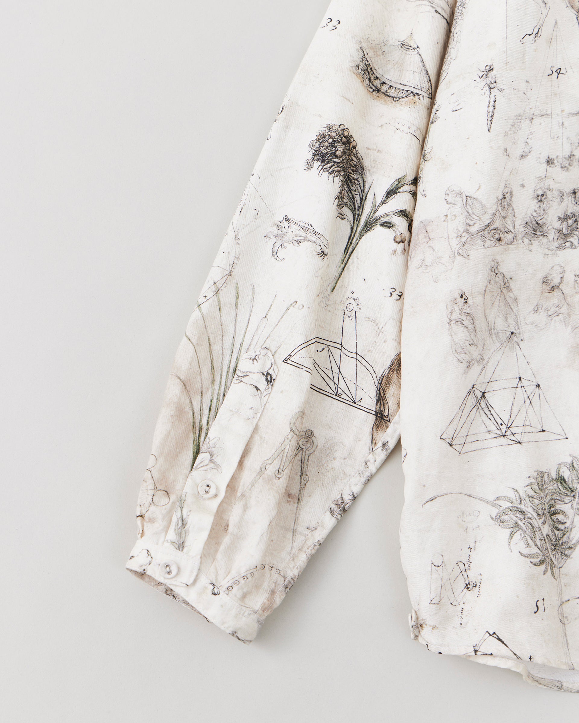 レオナルド・ダ・ヴィンチをインスピレーション源に作成したオリジナル柄をプリントしたビエラ素材のナローカラーシャツジャケット"V.CHAD "です。