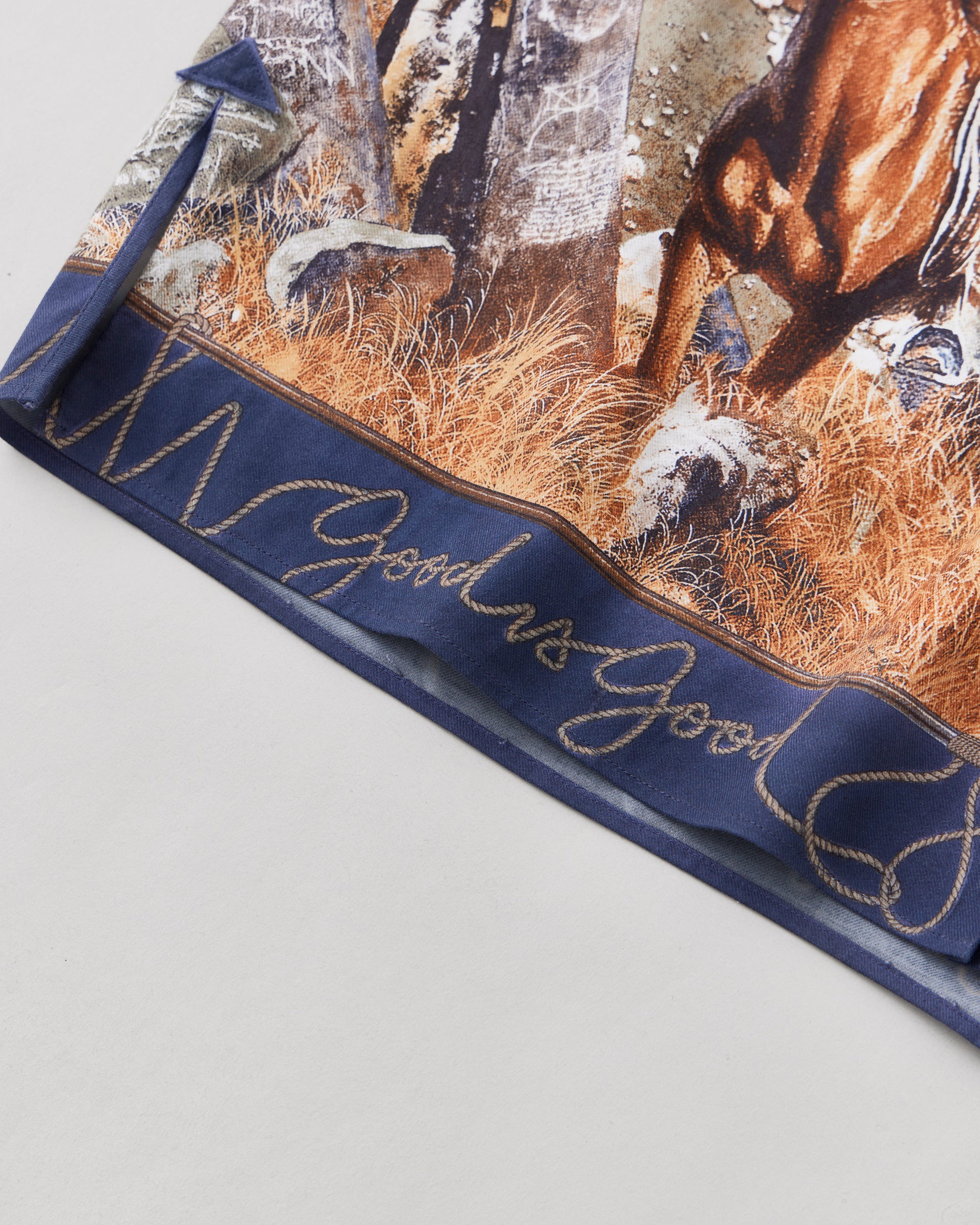 オリジナル柄のシルクスクリーンプリントを施したレーヨンコットン⽣地を使⽤した トラッカーシャツ”NUMAN ”です。