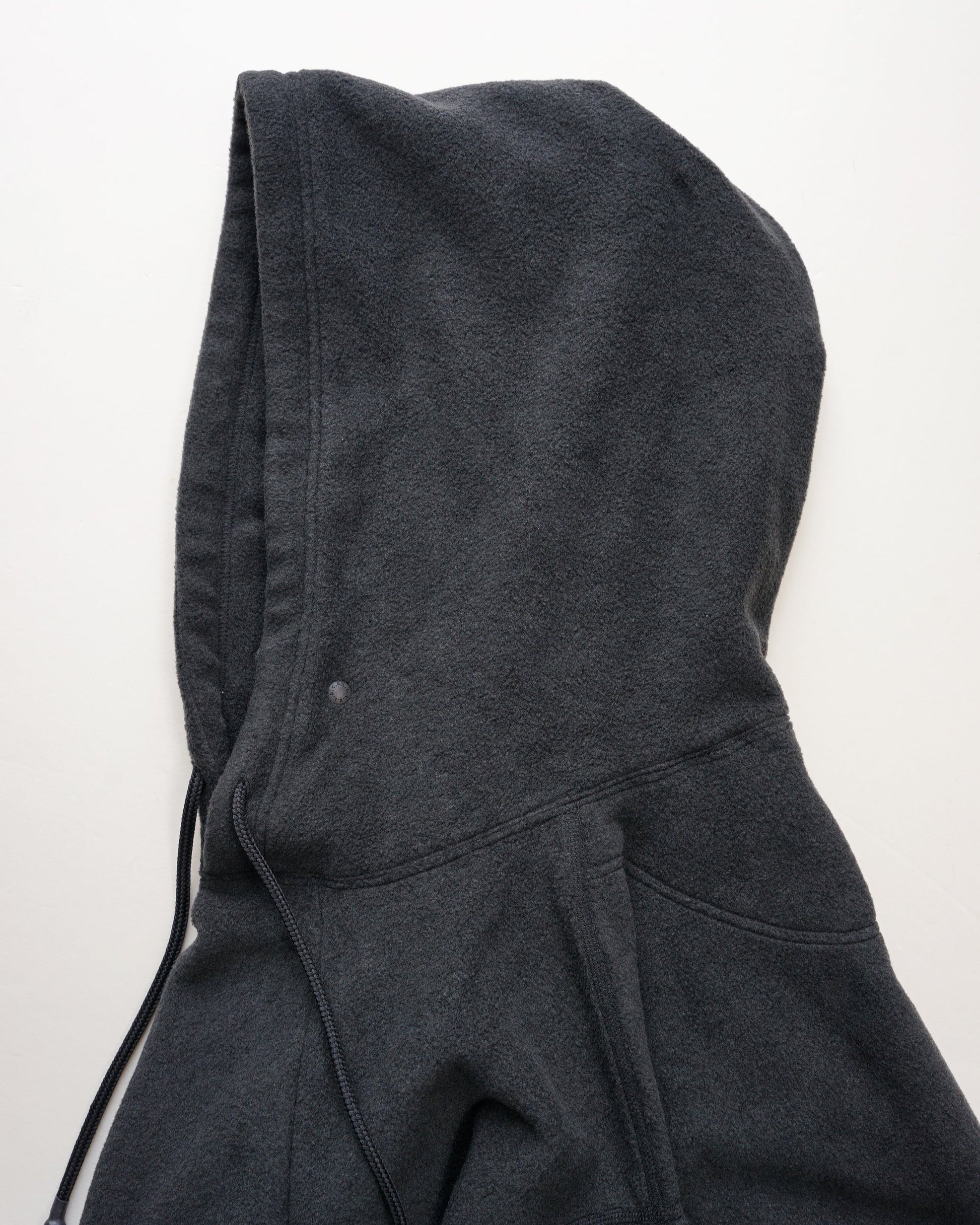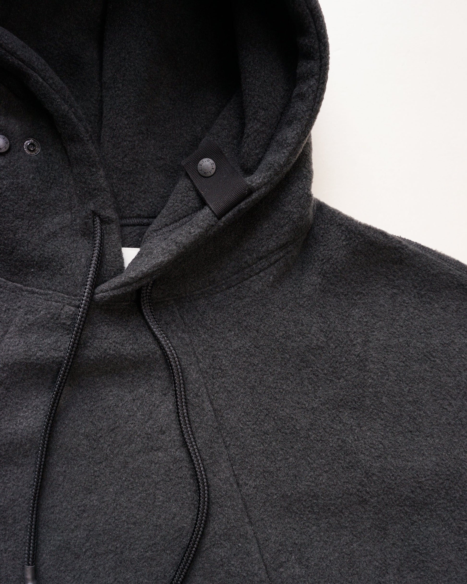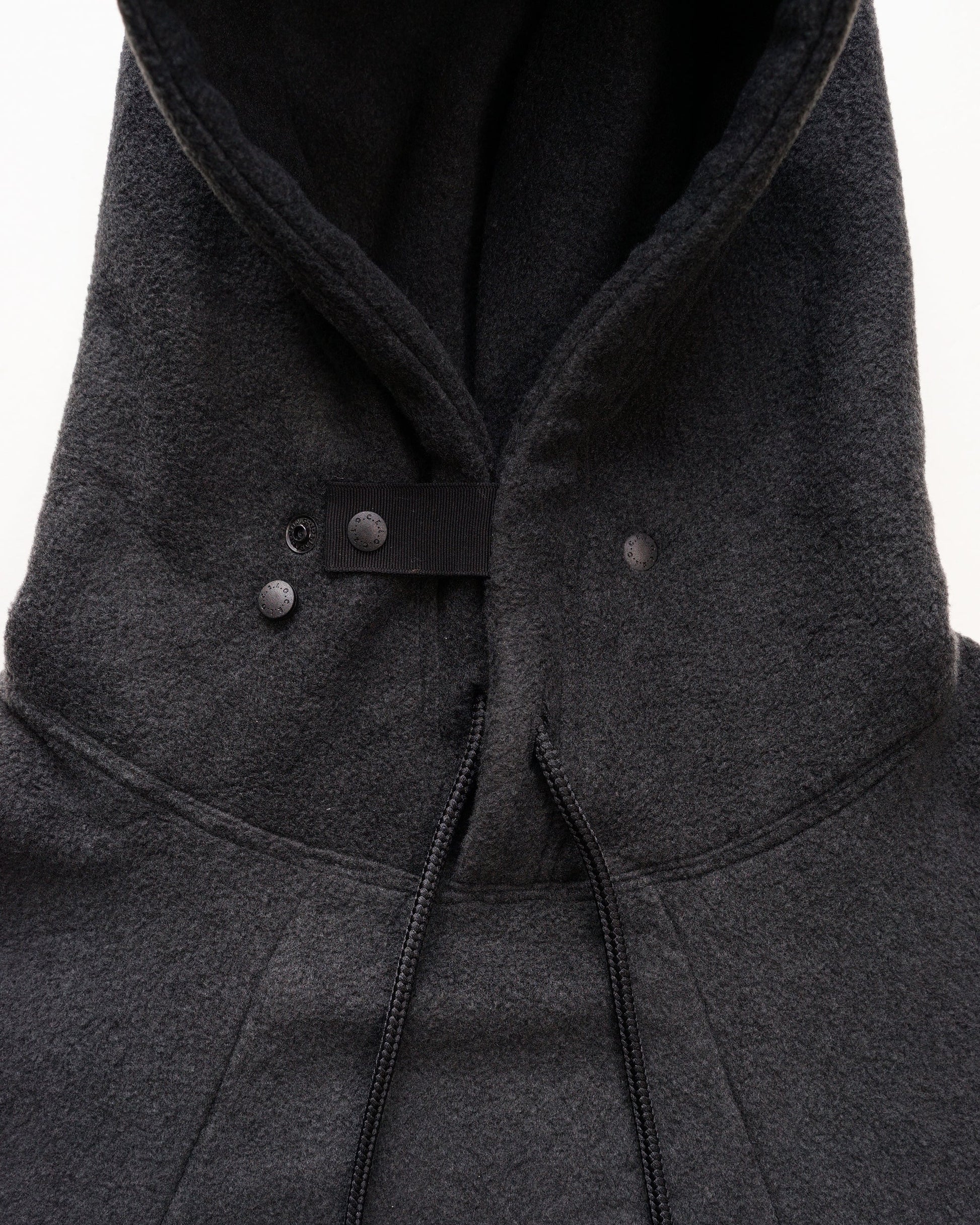 表地二重の大きなフードは首回りから頭全体の保温に最適で、フード口にはエンドにシュリンク加工を施したドローコードに加え、 ドットボタン付きテープタブを配し防寒仕様を更に強化。 生地段階でタンブラー処理を施している為、ピリングが起き難くなっています。
